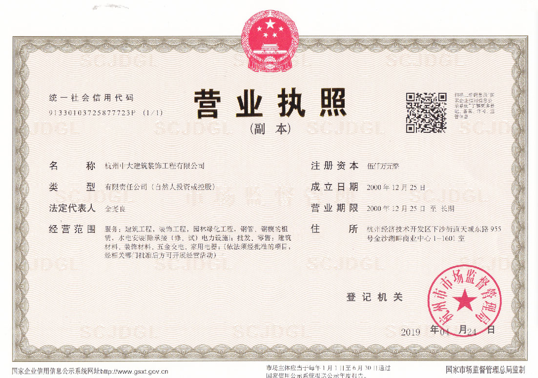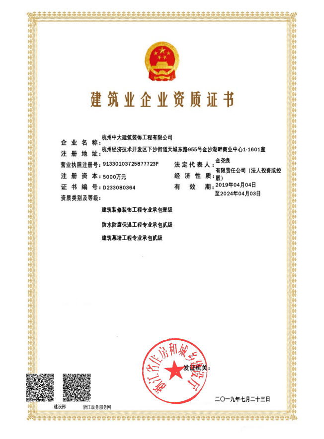 杭州中大建筑装饰工程有限公司成立于2000年12月25日,是一家集建筑装饰工程、机电安装工程为一体的专业化公司,拥有国家建筑装饰装修工程施工壹级资质,防水防腐保温工程专业承包贰级资质,建筑幕墙工程专业承包贰级资质。
